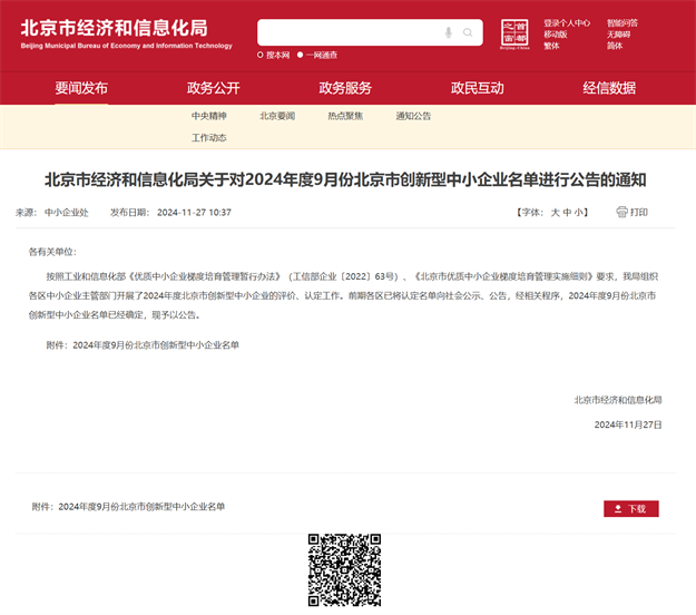 根據(jù)《北京市經(jīng)濟和信息化局關于對2024年度9月份北京市創(chuàng)新型中小企業(yè)名單進行公告的通知》(2024年11月27日),按照工業(yè)和信息化部《優(yōu)質中小企業(yè)梯度培育管理暫行辦法》(工信部企業(yè)〔2022〕63號)、《北京市優(yōu)質中小企業(yè)梯度培育管理實施細則》要求,2024年度9月份北京市創(chuàng)新型中小企業(yè)名單已經(jīng)確定,現(xiàn)予以公告。