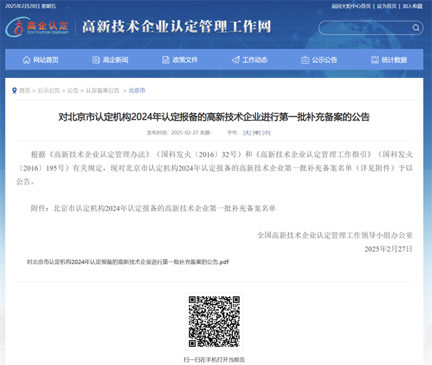 2025年2月27日,高新技術企業(yè)認定管理工作網(wǎng)披露,對北京市認定機構2024年認定報備的高新技術企業(yè)進行第一批補充備案的公告,