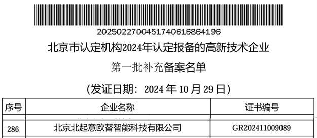 北京北起意歐替智能科技有限公司被認定為高新技術企業(yè),證書編號:GR202411009089,發(fā)證日期:2024年10月29日。